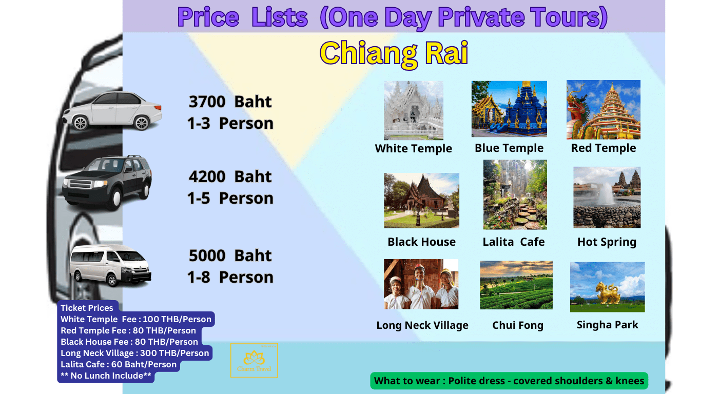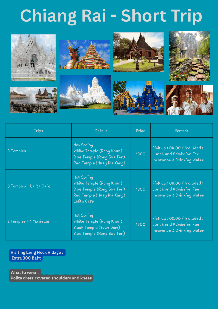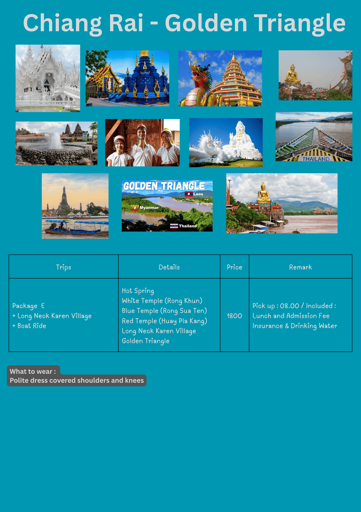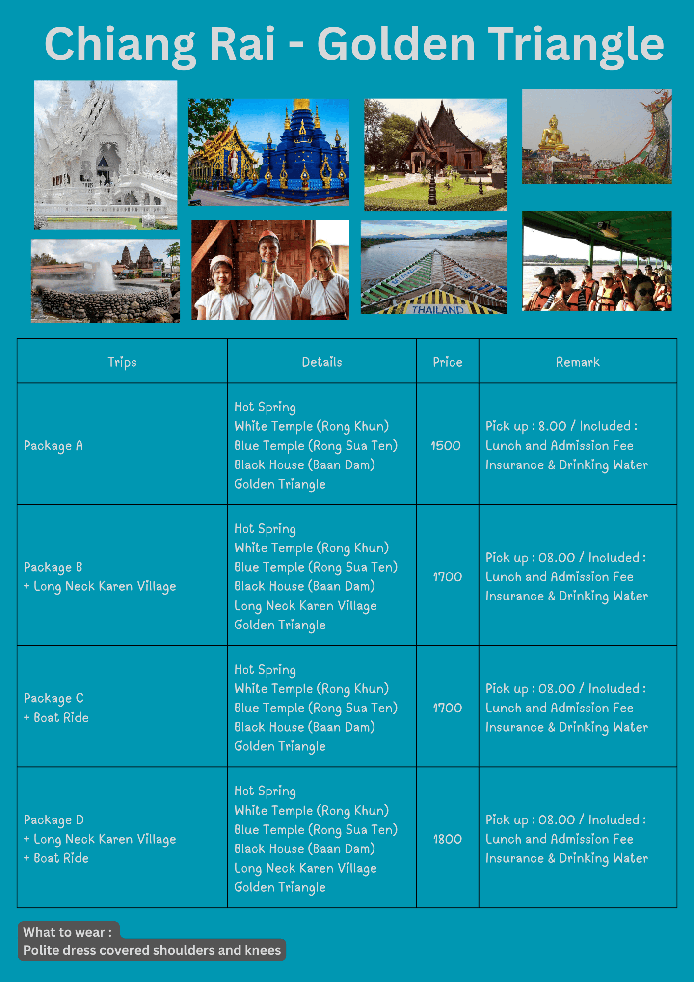 Chiang Rai This is a selection of the tours we have available in Chiang Rai. We can also arrange private bespoke tours for you. Please contact us for more details. Click on the images to view bigger size.